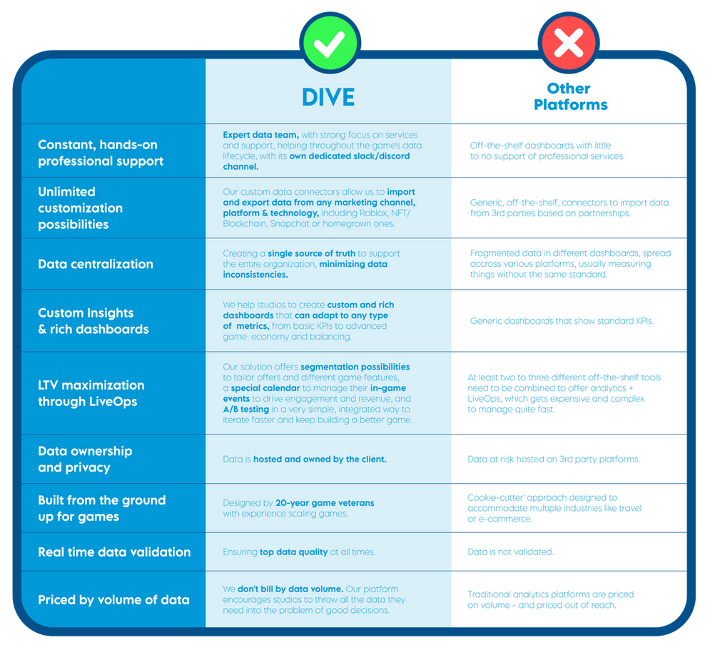 At Dive everything is tailored towards providing the bespoke data analytics and LiveOps solutions that you need.